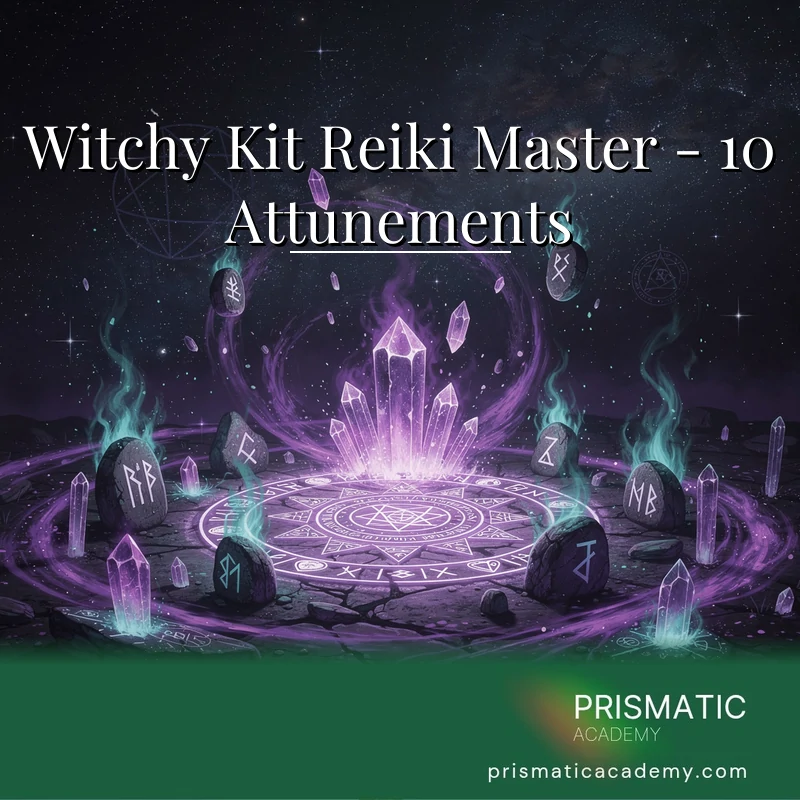 This witch-focused Reiki package provides ten specialized attunements combining Reiki energy with witchcraft practices. Each attunement addresses specific magical needs and witchy skills. This system may support combining Reiki with magic, enhanced spellwork, magical healing, and witchy energy work.